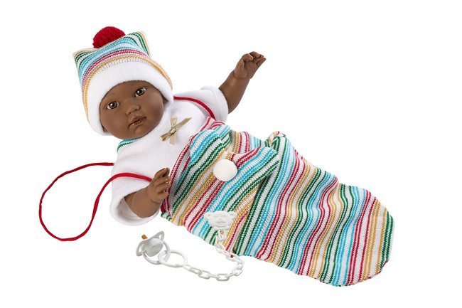• Next, the quality. Hand made in Spain, Morgan not only comes dressed in a super soft velboa fleece onesie and knit pom-pom baby cap, but you also get the beautiful bonus matching swaddle sack for free.