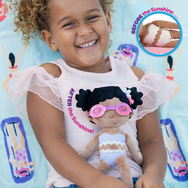 Sunny Days dolls are soft and cuddly play companions that wear a summer shorts set over a 2 piece bathing suit - that turns from white to violet when exposed to the ultraviolet rays of the Sun! It's both a Wow! play moment and a healthy skin teachable moment for your child.